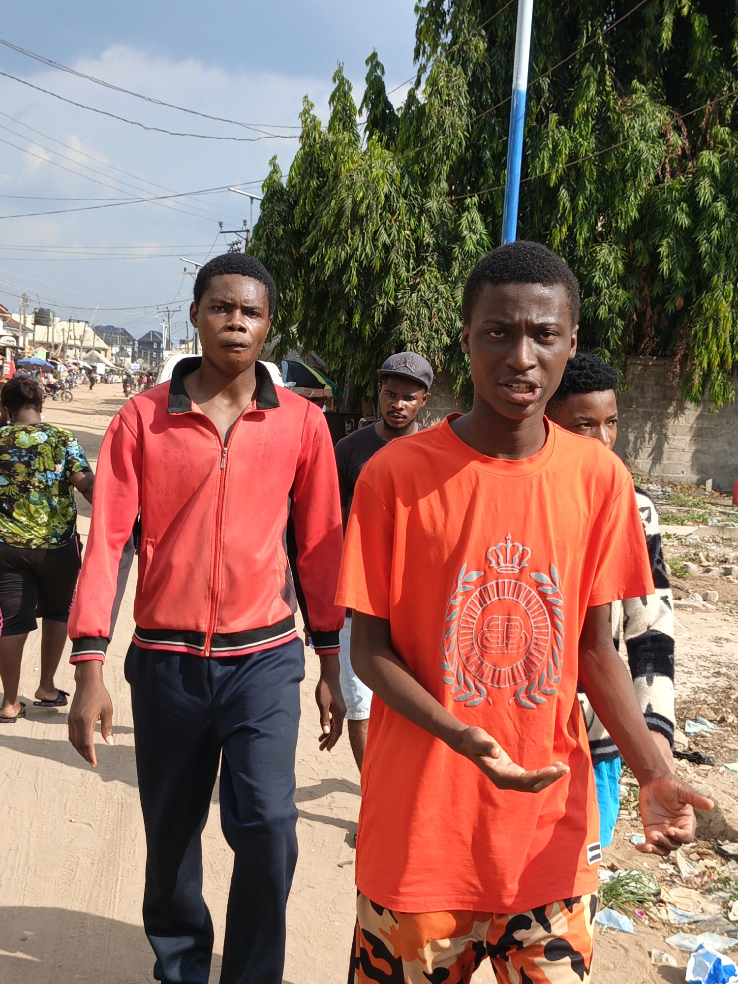 The image captures an outdoor scene on a dirt road in Unknown, Unknown, under a light blue sky with scattered white clouds. In the immediate foreground, two young Black males walk towards the viewer. The male on the left wears a red zip-up jacket with a black collar and black and white striped cuffs and hem, over dark blue trousers; he looks directly forward with a slightly open mouth. The male on the right wears a bright orange short-sleeved t-shirt featuring a grey embossed crown, wreath, and "BB" monogram, paired with orange, black, and brown camouflage shorts; his right hand is open and extended forward, and he looks towards the viewer with an open mouth. Behind these two, several other individuals are visible. To the left, a person, likely female, with dark hair tied back, walks away from the camera wearing a multi-colored floral top and dark shorts, with sandals. Behind the orange-shirted male, another young Black male wears a grey baseball cap (partially displaying "JORDAN") and a dark t-shirt, looking towards the left. Partially obscured by the orange-shirted male, a fifth young Black male wears a black and white patterned long-sleeved shirt and light blue shorts. The ground is a light brown dirt path, with scattered white and blue debris visible on the right side. To the right, a dense line of tall, narrow green trees borders the path, behind which a concrete block wall is partially visible. In the background to the left, numerous low-rise buildings with various roof types indicate an urban or semi-urban area, with overhead utility lines crisscrossing the sky. A distinct blue and white striped pole stands vertically in the midground, behind the foreground subjects. The scene is brightly lit by natural sunlight.