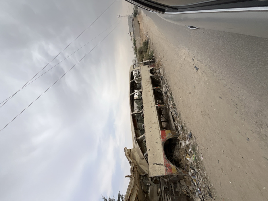 The image depicts a desolate urban environment in Harasta, Syria, under an overcast sky. In the midground, an extensively damaged and derelict passenger bus is positioned parallel to a dirt-and-gravel shoulder. The bus, originally light-colored with red and yellow stripes along its lower body, shows significant structural collapse at its front end, with twisted metal and missing panels. Numerous circular perforations, consistent with bullet or shrapnel impacts, are visible along its side panels. Most window panes are absent, revealing a gutted interior with remnants of seating frames. The bus lacks tires, resting directly on its hubs or axles. Accumulated debris, including plastic refuse, discarded materials, and dirt, surrounds the base of the bus. Behind the bus, sparse, dry vegetation and what appears to be a smaller, damaged structure are visible. To the far left, a portion of a green-leafed tree is present. To the immediate right of the bus and its associated debris, an asphalt road runs parallel to the scene. In the foreground on the far right, the side of a light-colored vehicle, from which the photograph appears to be taken, is visible, including a door handle. In the background, on the right side of the frame, several buildings, some appearing incomplete or damaged, are visible, along with utility poles and overhead power lines extending across the sky. The sky itself is heavily clouded with varying shades of gray, indicating an overcast condition. No individuals or active subjects are present in the scene.
