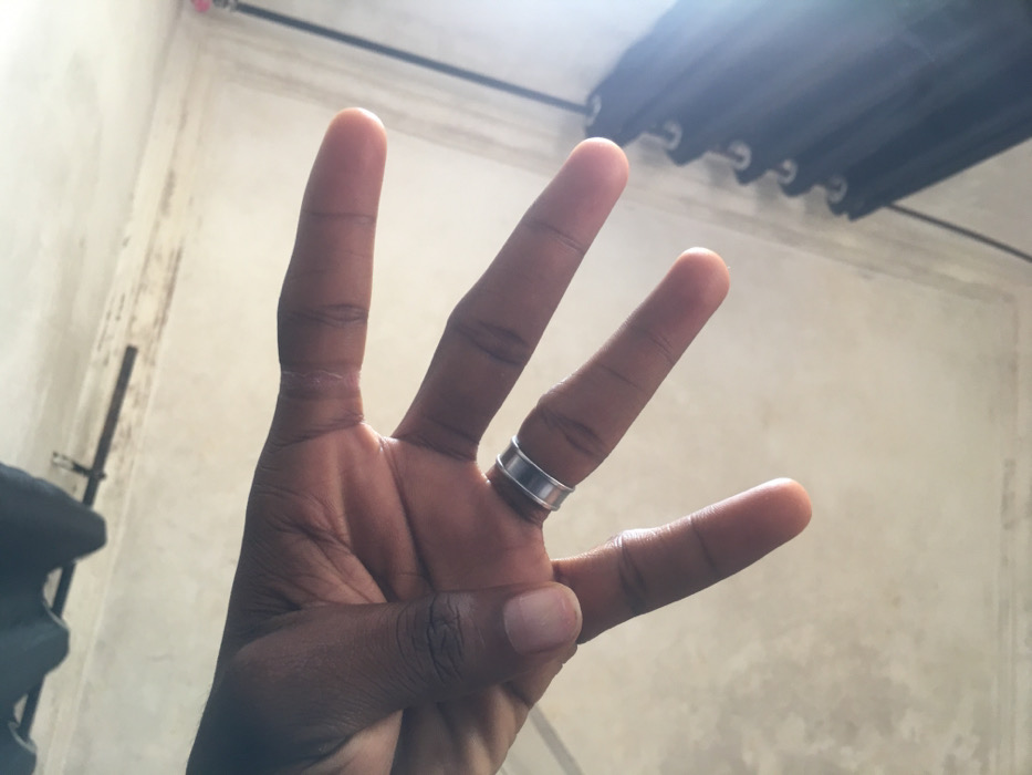 A forensic description of the scene in Iranla, Nigeria: The image displays a dark-skinned human hand, viewed from below, with the palm facing upwards and fingers splayed. A plain, silver-colored ring is worn on the proximal phalanx of the ring finger. The background consists of a light-toned ceiling exhibiting subtle discoloration and texture. To the right of the hand, a dark-colored pleated curtain hangs, illuminated by a bright, unseen light source located off-frame to the right.