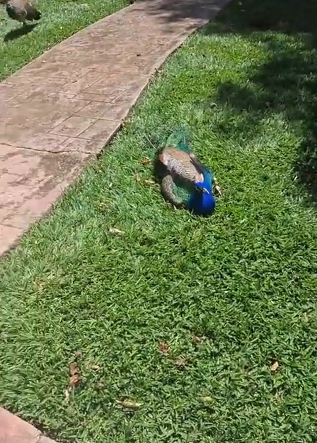 several peacocks on a grassy lawn next to a brick walkway. The lawn is well-maintained, with lush, green grass. There are also some bushes and plants visible in the background. The peacocks are seen walking around and resting on the grass. The camera moves around to capture different views of the peacocks and the surrounding environment.
