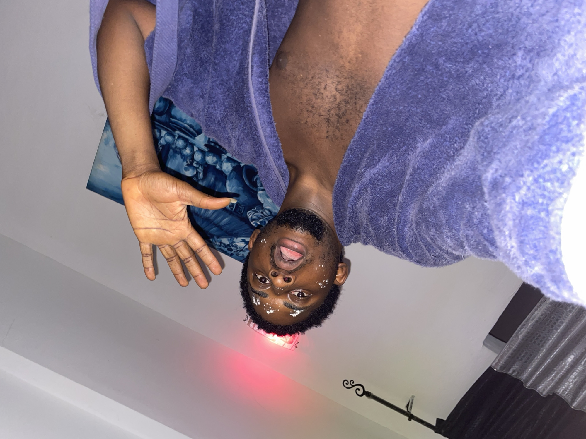 A male individual with dark skin, short dark hair, and a beard is depicted indoors, engaged in a selfie-style photograph. He is wearing a dark blue terry cloth towel or robe draped over his upper body, with his chest partially exposed. White specks are present on his forehead, nose, and cheeks. His eyes are open, looking towards the camera, with his mouth slightly ajar and tongue partially extended. His right hand is raised, fingers splayed, palm facing the viewer. The background consists of white walls and a white ceiling. A red light source is visible on the ceiling, casting a red hue above his head. To the upper left, dark, textured curtains hang from a black curtain rod. To the right and behind the subject, a framed artwork with a blue color palette, possibly depicting spherical objects, is partially visible. The scene is an indoor setting within Akwanga, Nigeria.