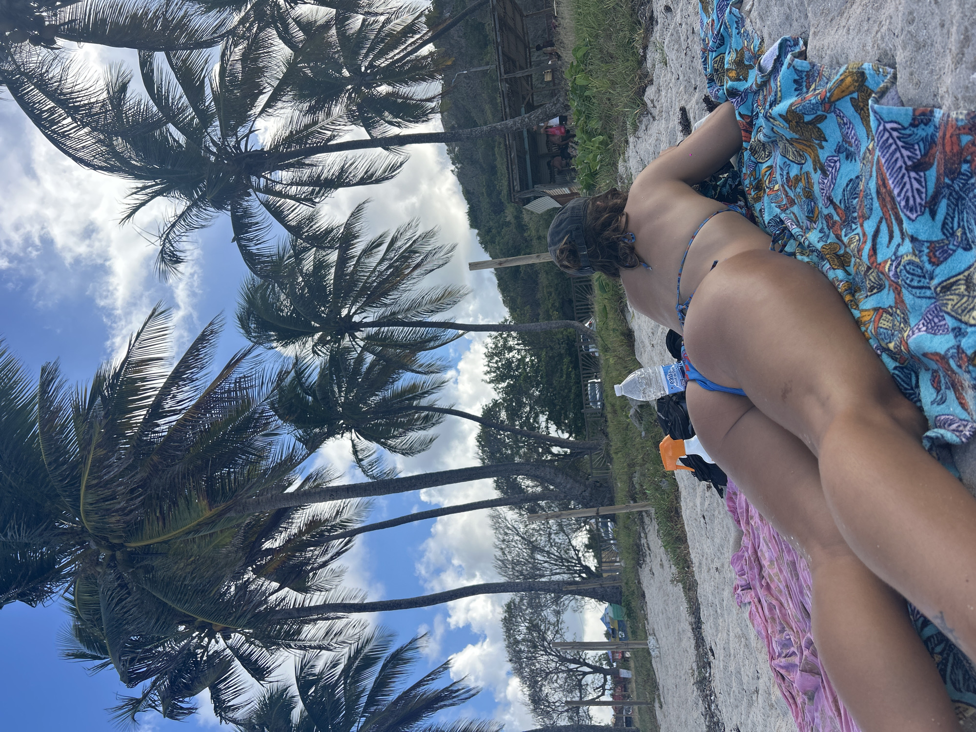 The image displays a sandy beach scene in Le Moule, France. In the immediate foreground, a person, appearing female, lies prone on light-colored sand, facing away from the camera. They are wearing a blue string bikini and a dark baseball cap, with brown hair visible beneath the cap. The person rests upon two towels: a pink one and a blue one featuring a colorful leaf/coral pattern. To the left of the person's head, a clear plastic water bottle with a blue label and an orange-capped white spray bottle are visible on the sand, alongside a dark fabric item. The midground features a sandy expanse transitioning into patches of green vegetation and several rough wooden posts vertically embedded in the ground. A prominent line of multiple tall palm trees, characterized by long, dark green fronds and visible coconuts, dominates the upper half of the image against a partly cloudy blue sky. In the mid-distance to the right, a rustic, open-sided structure with a corrugated metal roof shelters several indistinct human figures. This structure is situated at the base of a large, green, vegetated hill that rises significantly in the background on the right side of the frame. Further left in the distant background, other trees, faint outlines of vehicles, and colorful structures are discernible.
