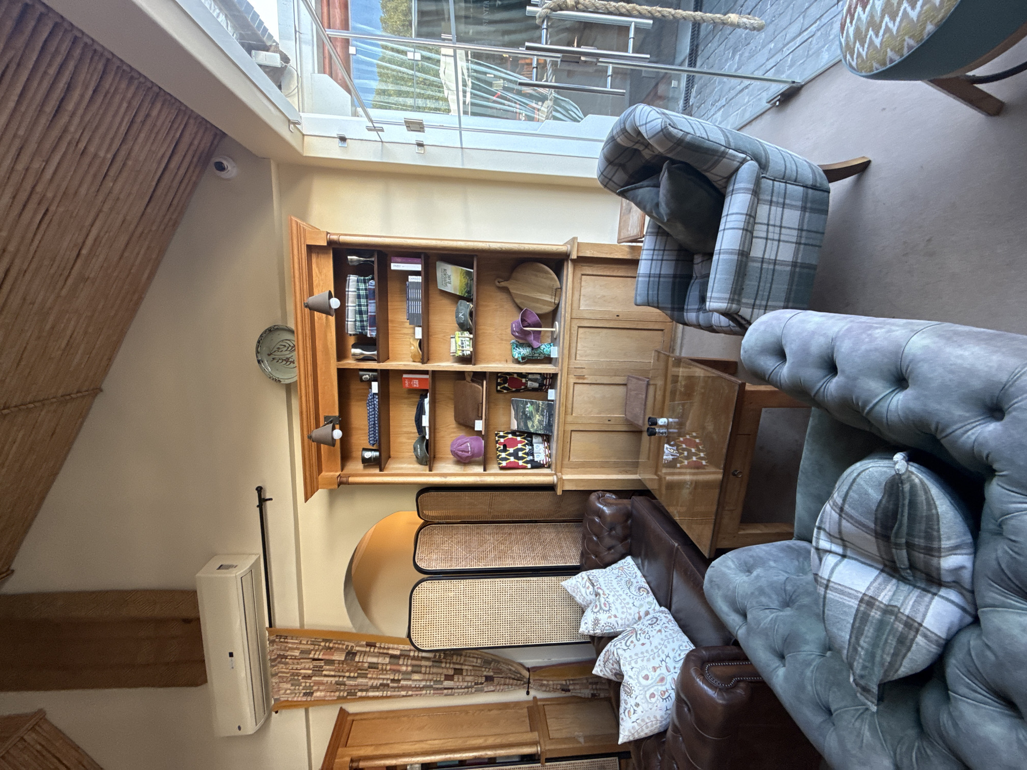 n interior space with a mix of furniture and decor. There's a large wooden cabinet against a wall, displaying various items. In front of the cabinet, there is a brown leather sofa with decorative pillows and tufted blue armchairs. A coffee table sits in the center of the furniture arrangement. Large windows are overhead, offering a glimpse of the outdoors. It is not possible to determine the location in the city of Cape Town, South Africa, as there are no indicators that would give away its geographic location.