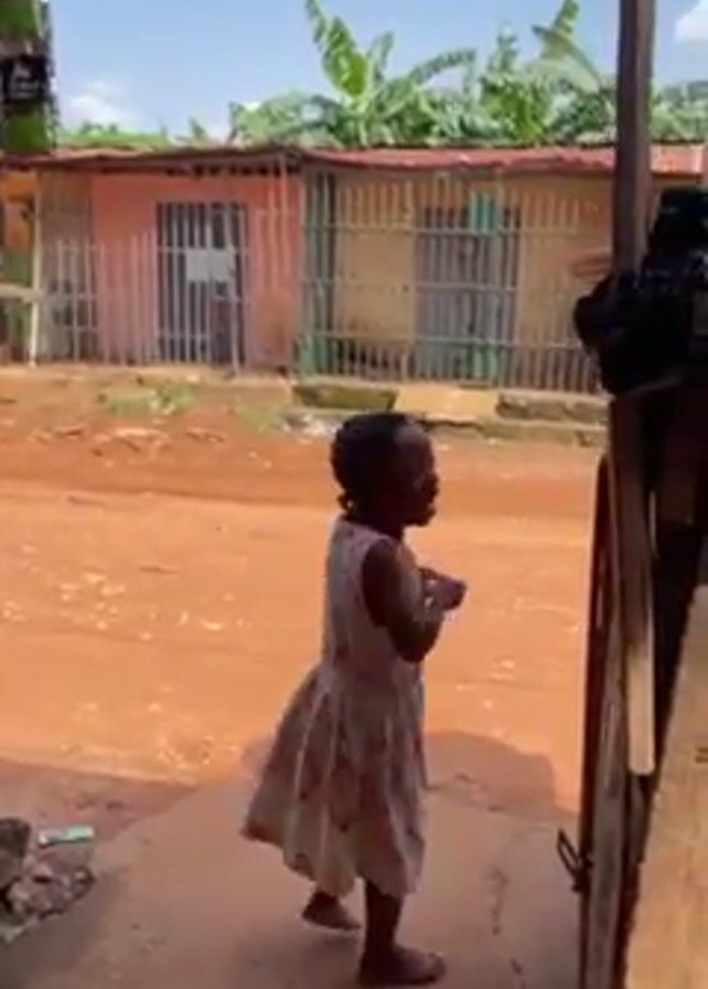 A young girl in a white and pink dress stands near the entrance of a shop, facing away from the camera and towards a reddish-brown dirt road. She has dark hair styled in braids and appears to be crying or yelling. The shop is a small wooden structure. Across the road, there are small buildings with barred windows. Banana trees are visible in the background under a partly cloudy sky. The video is shot from inside the shop, partially obscured by wooden beams and merchandise.