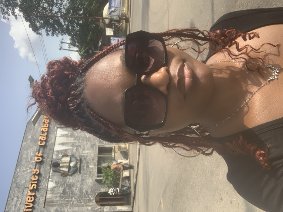 A daytime, eye-level, selfie-style photograph depicts a female individual in the foreground with the entrance of the University of Calabar in the city of Calabar, Nigeria, in the background. The foreground subject has dark skin, wears large octagonal-framed dark sunglasses, silver hoop earrings, a silver-colored necklace with a leaf-motif pendant, and a black ribbed garment. Her reddish-brown braided hair is styled in a high bun with loose, curly strands. Her lips are slightly pursed. Strong sunlight illuminates the scene, casting prominent shadows. In the mid-ground, the main entrance of a grey, stone-clad building is visible, featuring "UNIVERSITY OF CALABAR" in orange lettering and a crest below the text. To the left of the building's entrance, two males are present: one in a light-striped shirt and dark trousers, and another in a brown shirt and dark trousers, both walking on an asphalt road. The environment includes green foliage from trees and shrubs, utility poles with wires, and a partial view of a distant sign. The sky is partly cloudy blue.