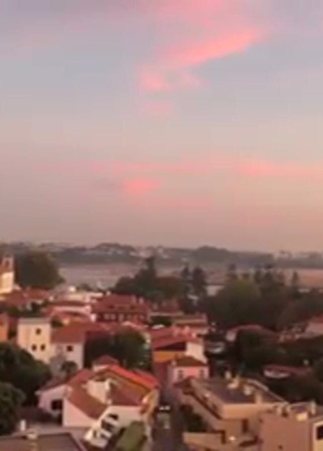 The video provides a wide, establishing shot of a neighborhood near the ocean, probably taken from a high vantage point. The view includes several houses with red tile roofs, interspersed with green trees and some taller buildings in the distance. Beyond the buildings, the ocean is visible, meeting the horizon. The sky is colored with hues of pink and orange, indicative of either sunrise or sunset.