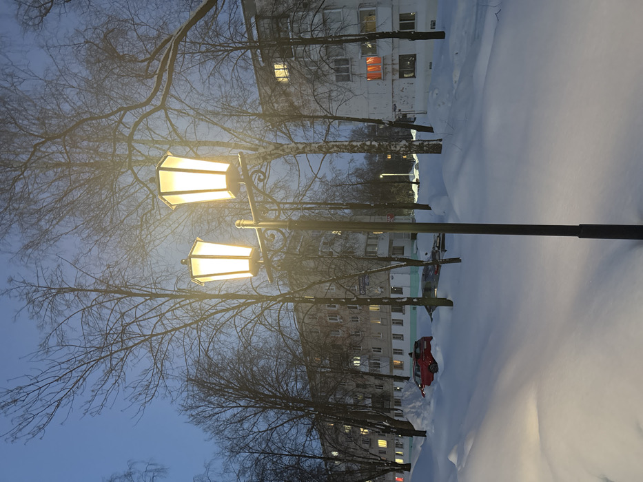 A winter scene at dusk shows a snow-covered area with buildings in the background. Bare trees frame the scene. A vintage-style lamppost with two glowing lanterns stands prominently in the foreground, casting light onto the snow. A red car is partially buried in the snow. Lights are visible in some of the building's windows. The sky is a mix of blue and gray, suggesting either early evening or a cloudy day.