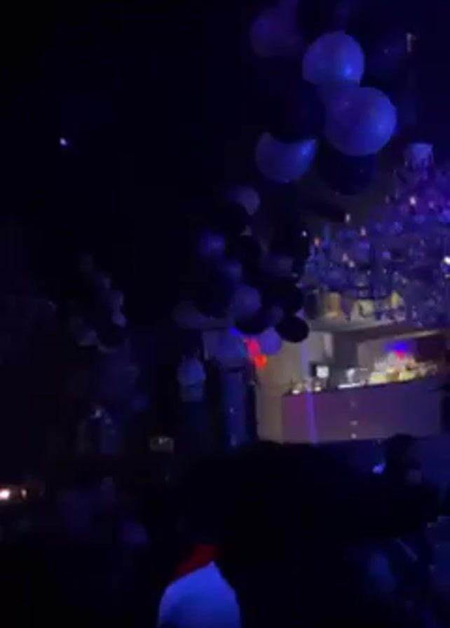 crowded nightclub with people dancing. The lighting is dark with blue and purple lights flashing. There are black and white balloons floating near the ceiling, and a reflective, decorative object hangs above the bar area. People's faces are mostly obscured due to the lighting, but their silhouettes are visible as they move to the music.