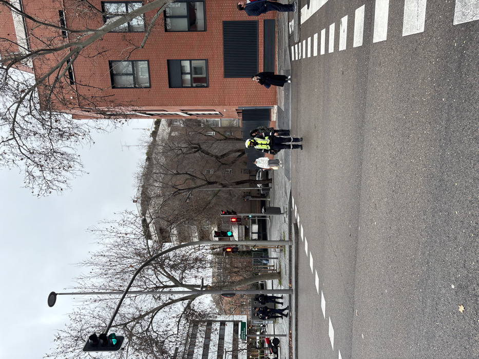 A street scene with people walking across a crosswalk. A group of people wearing yellow vests stand on the sidewalk near the crosswalk. There are buildings on either side of the street, and bare trees line the sidewalk. Traffic lights are visible, one with a green light. The sky is overcast.
