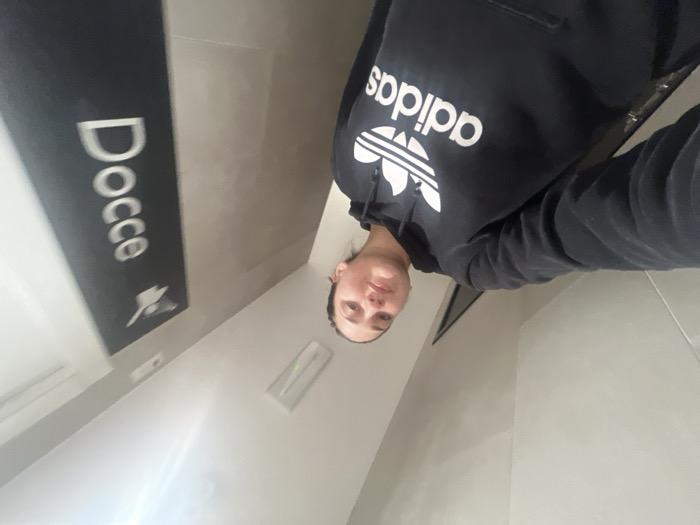 A woman in a black Adidas hoodie is in what appears to be a public restroom. A sign with the word "Docce" and a shower symbol is visible on the wall. The restroom's decor is modern, with white walls and a minimalist design.