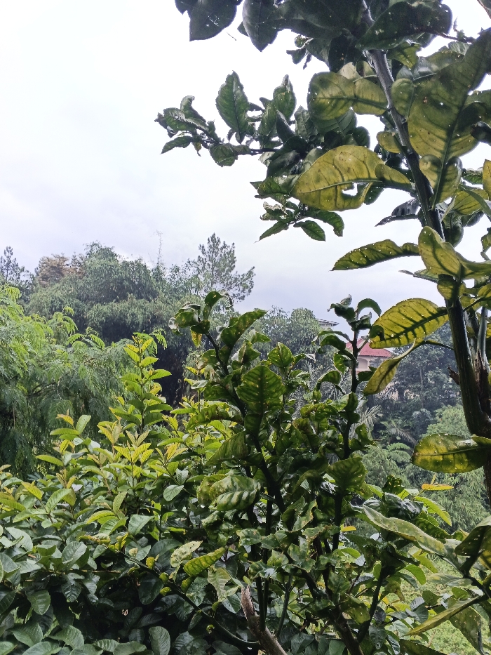The image displays an outdoor scene in Inawi, Papua New Guinea, under an overcast, light grey sky. The foreground is dominated by dense green foliage, with a prominent branch on the right featuring large, yellowish-green leaves, some exhibiting perforations and visible water droplets. Numerous other plants with smaller, vibrant green leaves, also appearing wet, fill the lower and central portions of the frame. The midground consists of a layered expanse of dark green trees and shrubs. Partially obscured by this vegetation in the upper midground, a building with a distinct reddish-brown tiled roof is visible. The background features distant forested hills and slender, taller trees silhouetted against the sky. No individuals or specific actions are depicted.