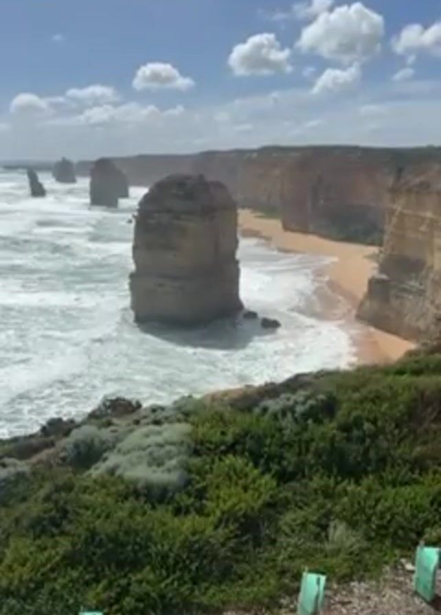 scenic view of the Twelve Apostles rock formations on the coast of Australia. The ocean waves crash against the base of the formations and the adjacent sandy beach. The clifftop viewpoint is covered in green vegetation. The sky is blue with scattered clouds. The wind is blowing hard and making noise. Several short, green posts are in the foreground.