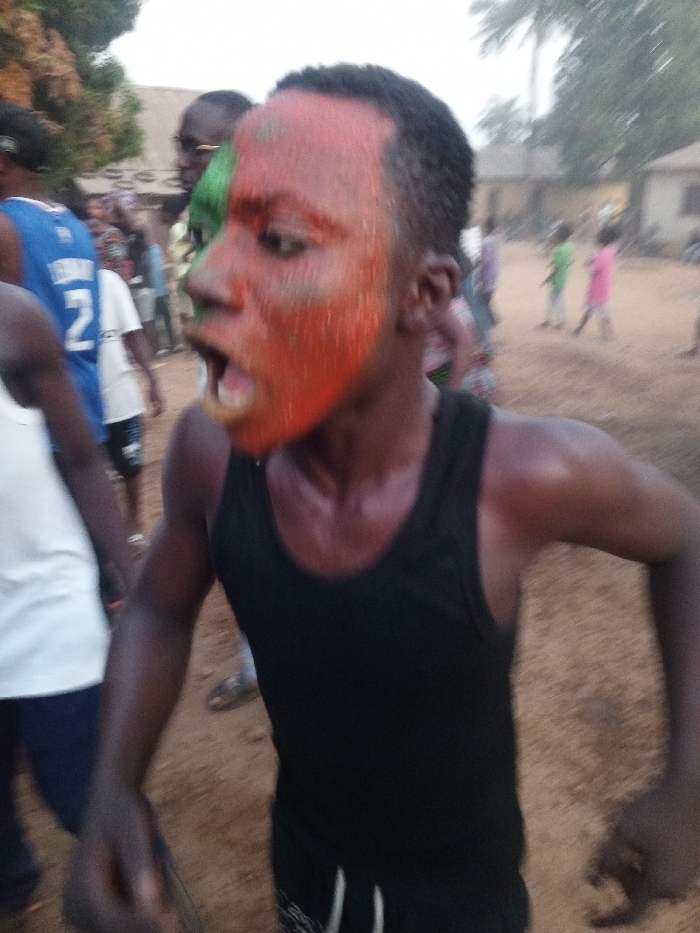 A young, dark-skinned person with red face paint yells, mouth agape, wearing a black tank top. Several other people are blurred in the background, dressed in casual clothing. The setting appears to be outdoors, on a dirt or sand-covered ground near a building and trees. The photo has a slightly blurred effect, suggesting movement.