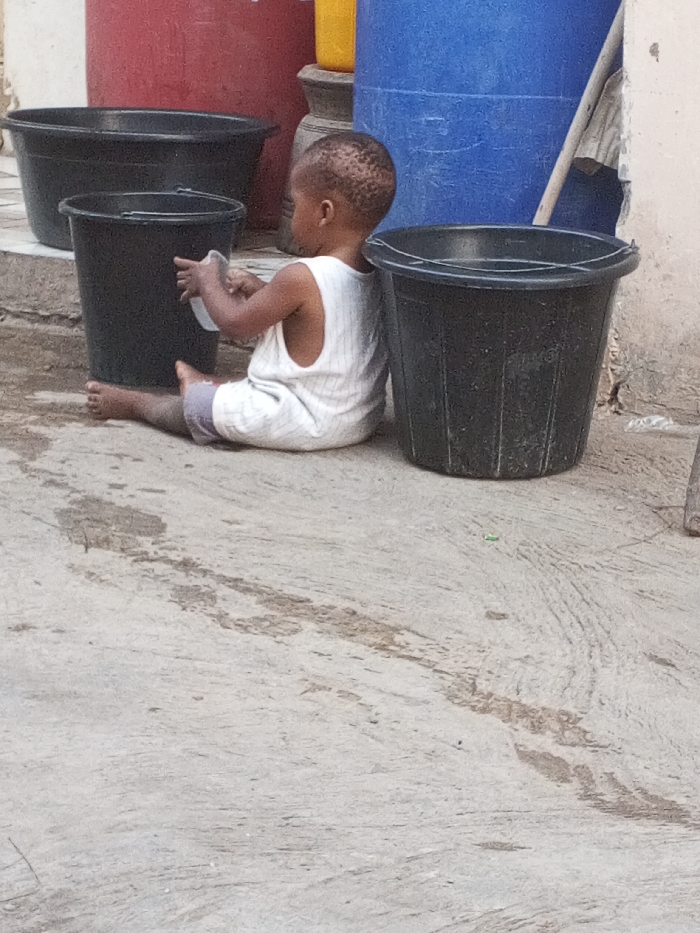 - "A child in a white tank top and shorts sits on a concrete surface next to a black plastic bucket, holding a white plastic object in their hands" by FM-qE6o93, licensed under CC BY 4.0