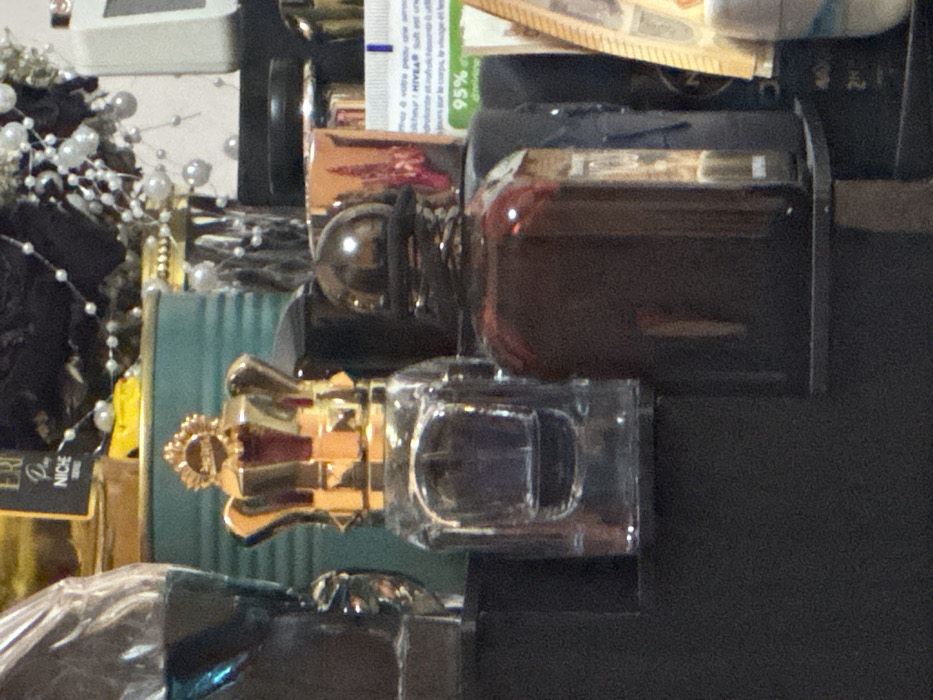 The image displays a static, close-up view of various bottles and cosmetic items arranged on a dark, flat surface. The scene is located within the city of Dryanovo, Bulgaria. In the foreground, on what appears to be a black shelf, a clear glass bottle with a distinctive gold-colored crown-shaped cap is centrally positioned. This cap features intricate detailing, including a central sunburst-like emblem. The bottle contains a dark liquid. To its right and slightly behind, a dark amber-brown glass bottle with a round, dark cap is visible, also containing a dark liquid. In the background, from left to right, a tall, partially visible clear bottle containing a blue liquid is present. Behind the crown-capped bottle, a teal or turquoise horizontally ribbed container is visible, above which a partial label fragment "ERI P NICHE" can be read. Further right, a decorative element composed of black floral shapes and strands of white spherical beads is apparent. On the far right, a white tube bearing the brand name "NIVEA" and displaying "95%" text is partially visible, alongside a brown or wooden patterned object. No individuals are present in the image, and no actions or interactions are taking place.