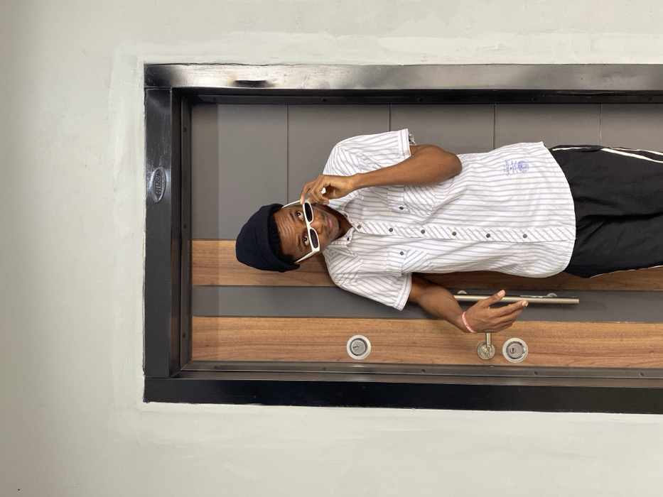 - "A person wearing a black beanie, sunglasses, and a striped shirt is lying sideways in what appears to be a modern elevator" by FM-pLZic2, licensed under CC BY 4.0