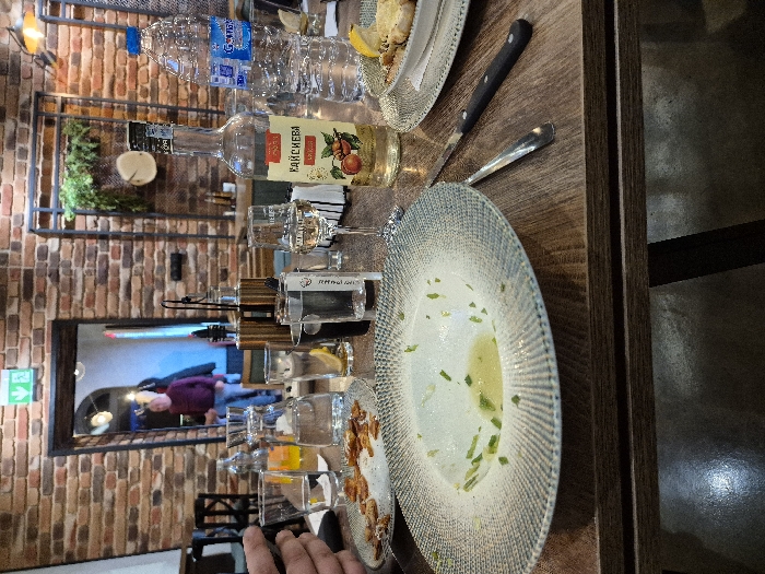 The scene depicts an interior view of a restaurant or bar in Lyaskovets, Bulgaria. A dark wooden table in the foreground is set with multiple items. Centrally located is a large, shallow, patterned ceramic bowl, mostly empty save for a small amount of yellow liquid and scattered green herb fragments. To its right, a knife with a black handle and a fork lie on the table. A partially visible plate on the right contains remnants of a meal, possibly chicken or fish with a topping. On the left, a person's left hand rests near a partially consumed plate containing small, golden-brown fried items. Beverages on the table include a clear glass bottle, approximately half full, with a label identifying it as "КАЙСИЕВА" (Kaysieva, apricot) rakia, positioned near a stemmed glass containing clear liquid. Behind it, a large, partially full plastic water bottle with a blue cap and a "GORSKA" label is visible. Several other clear drinking glasses, some containing water or a yellowish liquid, and a small metal bucket are also on the table. A small glass bottle with a yellow liquid is to the left of the rakia bottle. The background features an exposed reddish-brown brick wall. A dark-framed doorway is centered, above which a green emergency exit sign is mounted. Through this doorway, a man in a maroon long-sleeved shirt and blue jeans is visible, standing and facing towards the right. To the right of the doorway, a black metal decorative frame holds a potted plant and a circular wooden plaque. An illuminated fixture with an orange glow is visible in the upper right. The floor in the foreground is dark and reflective.
