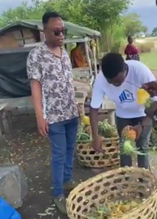 Here is a brief description of the video: The video shows three men outdoors, surrounded by pineapples
