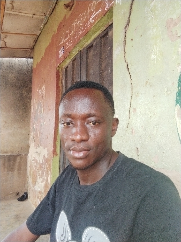 The image depicts a young black man, wearing a black T-shirt with a gray graphic, standing in front of a cracked, weathered wall with faded red and green paint. The wall has an old wooden door on its right side, and the door appears to be closed. The man's eyes are directed at the camera, and his expression is neutral. The image was taken in Asuir, Nigeria, at the coordinates latitude: 7.685, longitude: 8.536. The man appears to be standing in the middle of the room, with what looks like a pair of black shoes lying on the floor in the left corner of the image. The picture was likely taken by someone standing in front of the man. The man's hair is short and neat. The background of the image is out of focus, but appears to be an outdoor scene. The image is well-lit, but the lighting is slightly uneven. The camera is slightly tilted to the right. The man's T-shirt appears to be new and clean. The image is likely a selfie or a portrait. The man's facial features appear to be sharp and defined. There is a slight smile on his face.