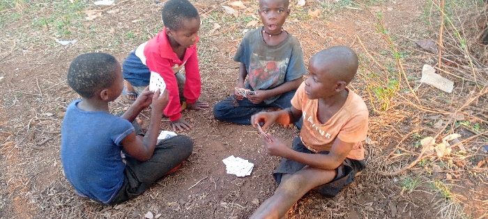 Four young children are depicted sitting on reddish-brown dirt, engaged in a card game in the city of Konongo, Democratic Republic of the Congo