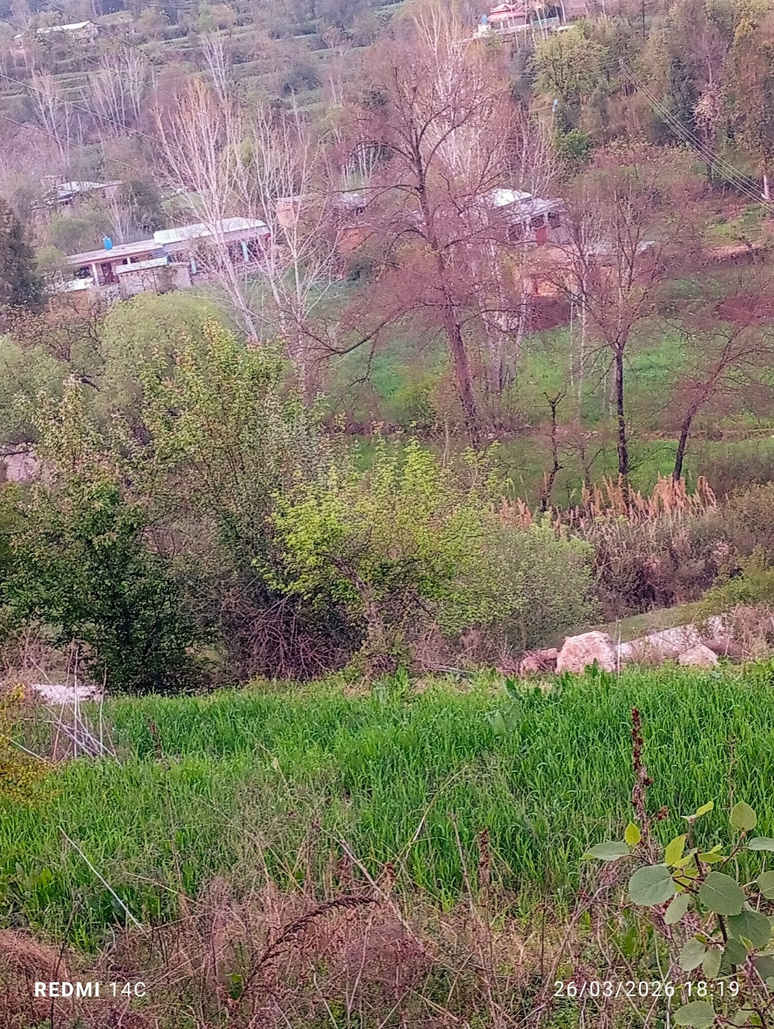 The image depicts a rural, mountainous landscape in Grhala, Pakistan, captured on March 26, 2026, at 18:19