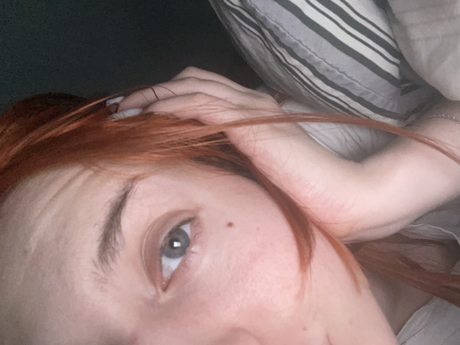 A close-up photograph depicts a portion of a female individual's face and left upper body, situated in an indoor environment, stated to be in the city of Engels, Russia. The subject's left eye, which is blue, is visible, along with her eyebrow, upper cheek, and part of her nose. A small, dark mole is present on the upper left cheek below the eye. Reddish-orange hair falls across her face and forelimb. Her left hand is positioned near her head, with fingers gently curled, revealing white nail polish. A thin, silvery chain-link bracelet is visible on her left wrist. She is wearing a light-colored garment. To the right of the subject, a pillow or bedding featuring alternating grey, white, and black stripes is present. The scene is dimly lit, with the background largely obscured by darkness.