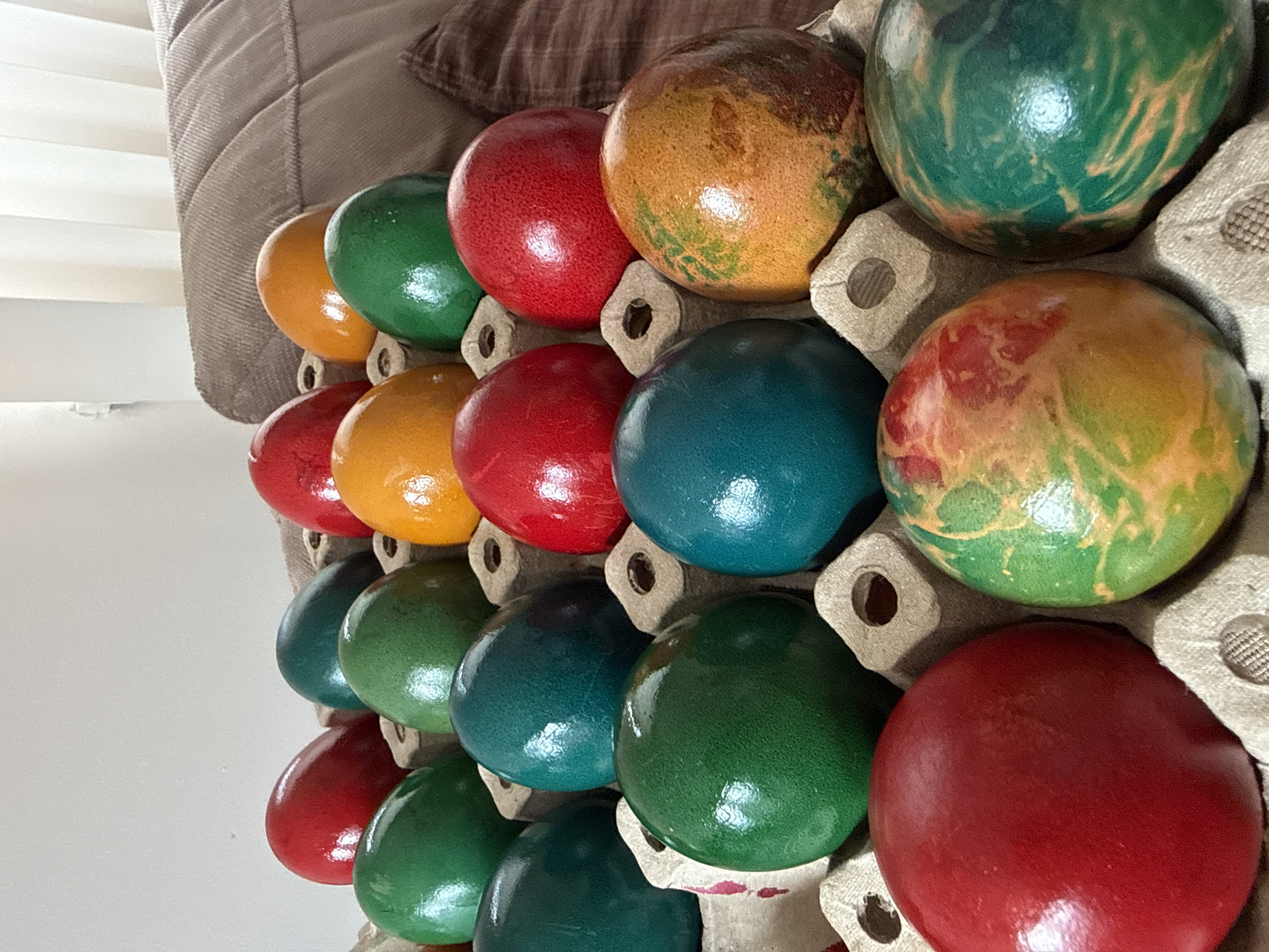 close-up of dyed Easter eggs arranged in a cardboard egg carton