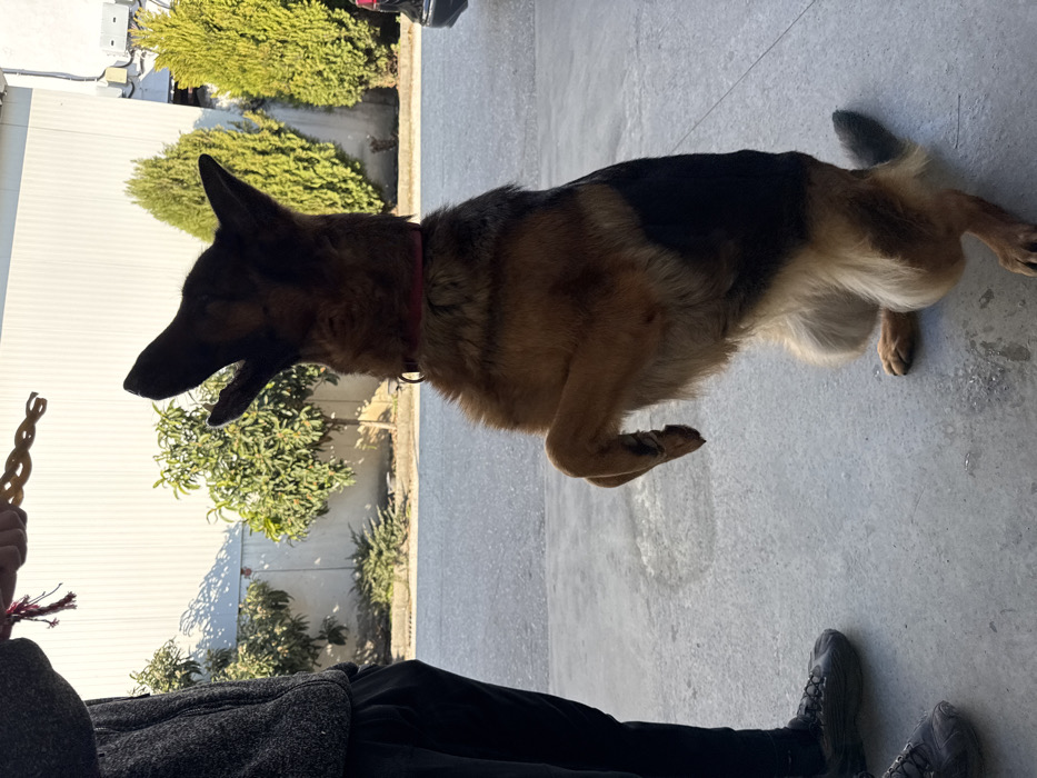 An outdoor scene depicts a person interacting with a German Shepherd dog on a paved surface in the city of Unknown, Unknown