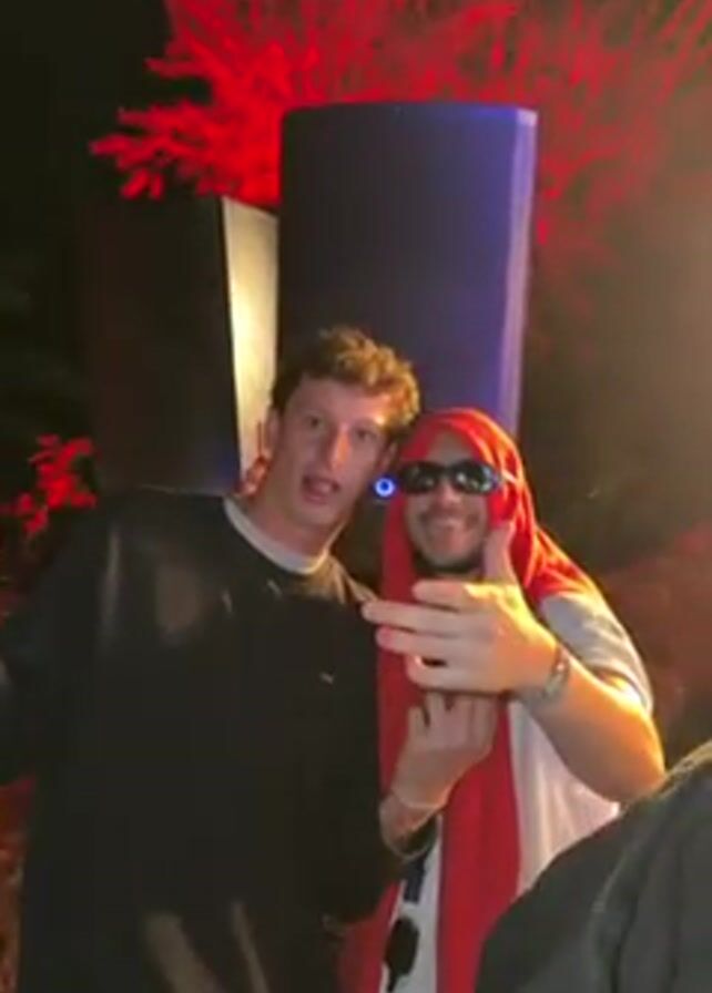 three people standing together at night, likely at a party. The person on the left is a young man with curly hair wearing a black sweatshirt and jeans. He is making a peace sign with his left hand and sticking his tongue out. To his right is another young man with a beard and sunglasses, wearing a white t-shirt and a red scarf draped over his head. He is making a hand gesture with his right hand that could be interpreted as flipping the bird, though it is partially obscured. In the foreground, on the left, a young woman with dark hair is visible, laughing and sticking her tongue out. Behind them are two large black speakers, one of which is lit with a blue light. Above the speakers is a tree-like plant with red lights illuminating it. The environment appears to be outdoors, possibly a garden or patio, with dark foliage visible in the background. The lighting is dim, with the red and blue lights providing the main illumination. The overall atmosphere suggests a lively and informal gathering.
