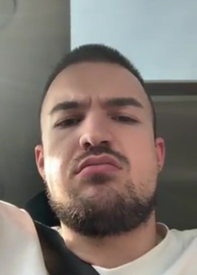 A man with short dark hair and a beard looks into the camera with a disgusted expression