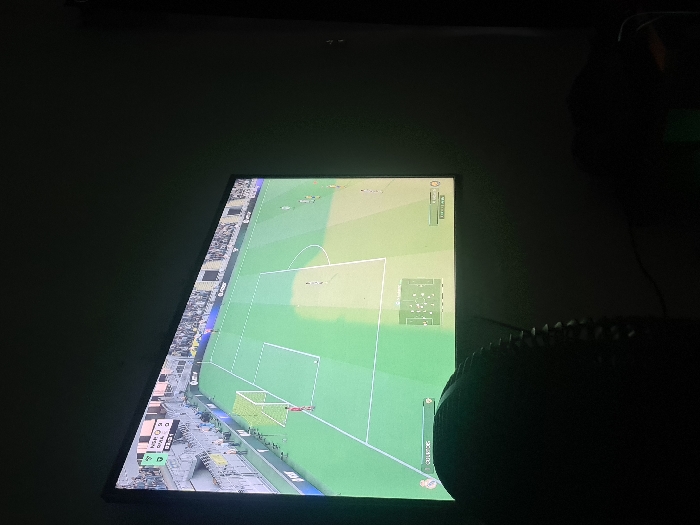A screen displays a soccer game. The field is brightly lit with green grass and white lines. On the left side, a score box shows NAR with 0 goals and GPL also with 0 goals. The game clock reads 52:51. A black object sits near the bottom right corner. The surrounding area is dark, suggesting a dim room.