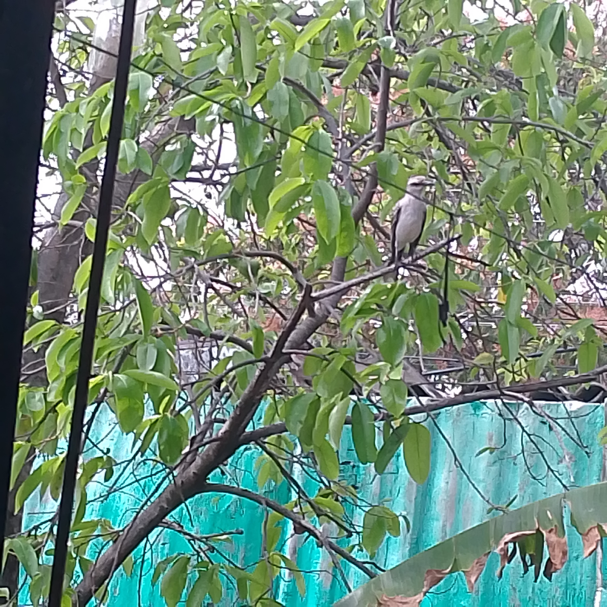 A bird is perched on a tree branch with dense green leaves. In the background, there's a corrugated metal fence or wall painted in a turquoise color. A banana leaf hangs in the lower right corner of the image. The photograph appears to be taken from indoors, through a window or doorway, as suggested by the dark vertical bar visible on the left side. The location is likely Juan Griego, Venezuela, based on the user's prompt. There are no people visible in the scene. The bird is facing to the left.