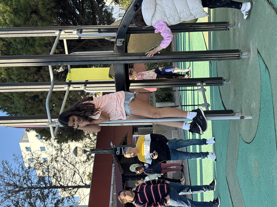 An outdoor scene in Quarteira, Portugal, depicts a public park or playground area on a clear day with evident sunlight casting shadows. The foreground features a young female subject with long dark hair, wearing a light pink t-shirt, distressed denim shorts, white ankle socks, and black Skechers sneakers. She stands with both feet on a vertical silver pole, part of a black and silver playground climbing structure, with her hands clasped near her chest and a smile on her face. To the subject's immediate right, partially visible in the lower right frame, a child wearing a pink top and a light beige puffer vest touches another vertical black pole of the same structure. In the mid-ground on the left, an adult male with short dark hair and sunglasses on his head wears a striped long-sleeved shirt (red, white, dark blue) and blue jeans, looking left. Beside him, another adult male wears a black, yellow, and white "Guess" sweatshirt, blue jeans, and white sneakers; he holds a dark object in his right hand and observes the young female subject. Several other indistinct adults are visible behind these two men. Further back on the right, another adult in a pink top and a small child in a blue hooded jacket are partially visible near other playground equipment. The ground is covered with a green, textured safety surface. A black street lamp post with a decorative top stands behind the group on the left. Behind the lamp post, a red-roofed structure with "Novo Grapico" signage is visible. Evergreen trees are scattered throughout the background, and a prominent white multi-story building with multiple square windows stands against a clear blue sky in the far background.