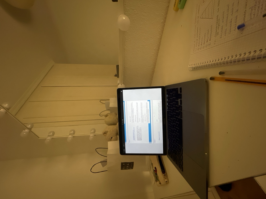 The image displays an indoor desk setup in Torrelodones, Spain, under warm artificial light
