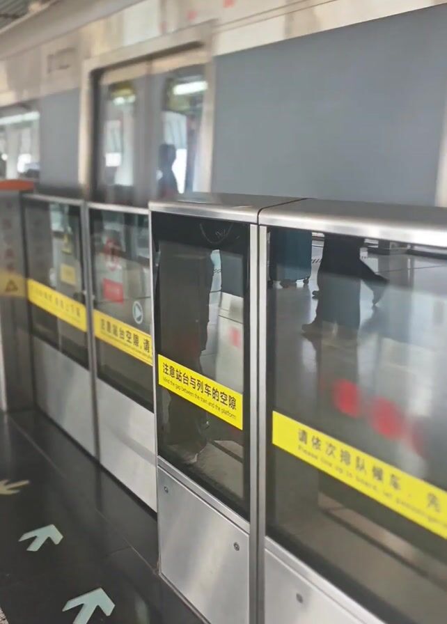 train arriving at a subway station. The platform has safety doors with yellow warning signs in Chinese and English. Arrows are painted on the floor to indicate where passengers should stand while waiting. The train's exterior is predominantly red and black. The doors of the train and platform align, and the doors open. Inside the train, a passenger wearing a mask sits and looks at a smartphone. The interior of the train appears to be clean with red seating.