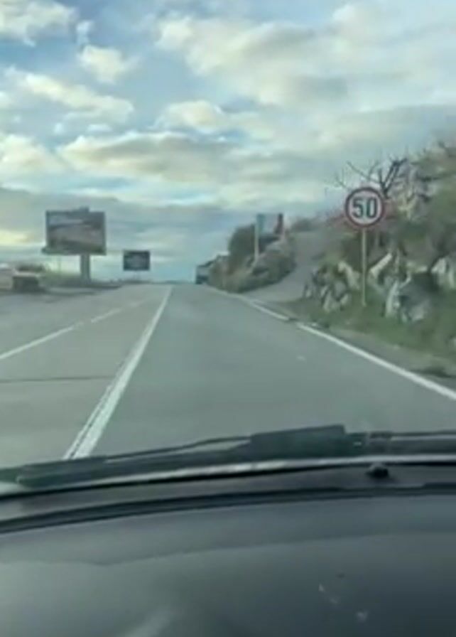 view from inside a car driving on a road. The road has two lanes separated by a white line. There are billboards on the side of the road and a sign indicating a speed limit of 50. There are also signs indicating a curve in the road. The sky is cloudy. The environment appears to be somewhat rural or suburban, with rocks and sparse vegetation visible alongside the road.