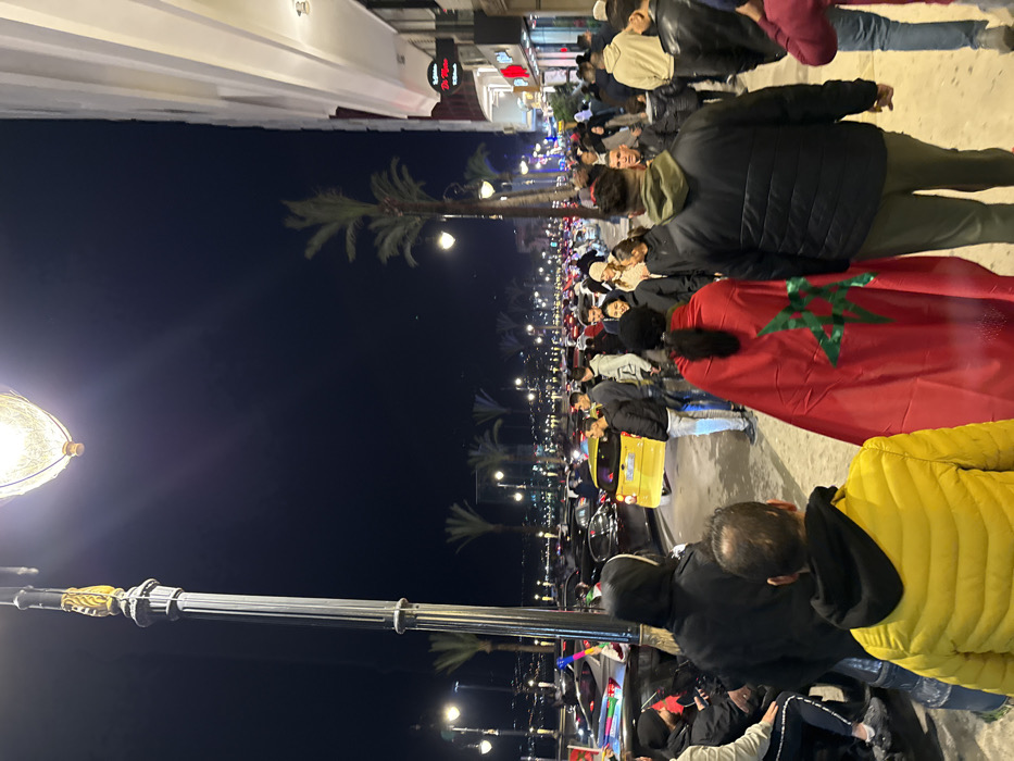 A nighttime street scene depicts a large crowd of people on a sidewalk. Palm trees line the street, illuminated by lamps. Many individuals wear jackets and casual clothing. A large Moroccan flag is prominently displayed. Cars are parked along the curb, and streetlights cast a glow on the scene. The overall atmosphere suggests a festive or celebratory gathering.
