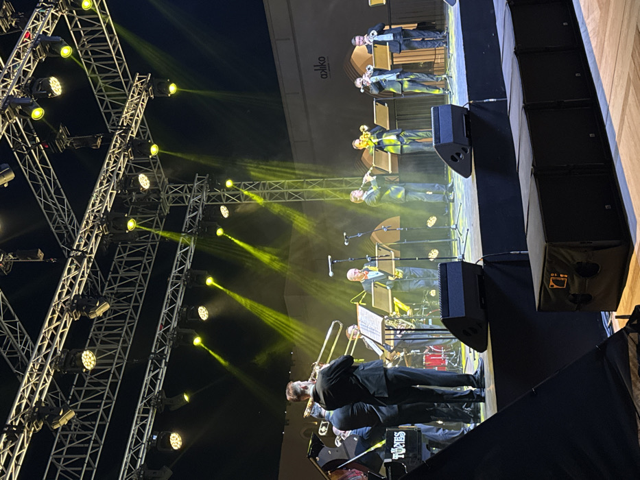 A live band performs on stage under bright yellow spotlights. The band members, in suits, play brass instruments like trumpets and trombones. A complex metal lighting rig stands to the left. Large black speakers are stacked on the right. The performance appears to be outdoors at night, possibly at a festival. The atmosphere is vibrant and energetic.
