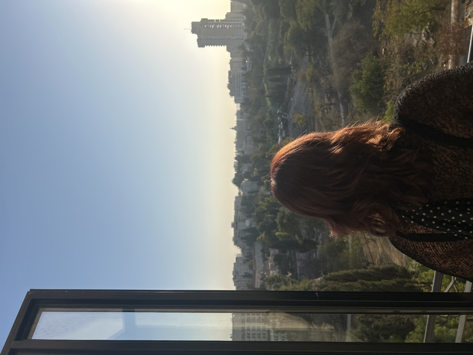 The image displays an elevated view of a city landscape under a clear, light blue sky, illuminated by sunlight from the right. In the immediate foreground, a dark-framed window or balcony door is partially visible on the left, reflecting light. The central foreground features the back of an individual's head and shoulders; the person has reddish-brown, wavy hair and wears a dark, possibly knit, garment, with a black strap featuring white polka dots visible over the left shoulder. The midground consists of a sprawling green area, indicative of an urban park or valley, densely populated with various trees and shrubs, interspersed with some dry patches of land. Beyond this green space, numerous light-colored multi-story buildings populate the city, extending towards the horizon. In the background, a prominent, tall, multi-story concrete building with a distinctive blocky, Brutalist architectural style and a flat roof stands on the right, identifiable as the Clal Center (Merkaz Clal). This architectural landmark, combined with the visible urban topography and green valleys (specifically the Valley of the Cross, Emek Hamatzleva), places the scene in Jerusalem, Israel, with the viewpoint likely from an elevated position in a central area, such as near the city center or Mamilla, looking generally westward towards neighborhoods like Rehavia. The sun's low angle and bright haze on the right suggest either morning or late afternoon light.