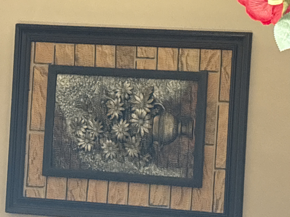 A vertically oriented rectangular framed artwork is depicted hanging on a plain, light-colored wall in the As-Salihiya Municipality, Syria. The artwork features a dark outer frame. Inside this, a textured inner border mimics light brown brickwork laid in horizontal courses. Centrally, a smaller, dark-framed image, rendered in monochrome or desaturated tones, portrays a still life. This central image depicts an urn-shaped vase filled with a dense arrangement of multi-petaled flowers, set against a textured background suggestive of darker brickwork and foliage. A blurry object with prominent red and green components, consistent with an artificial floral arrangement, is partially visible in the lower right foreground.