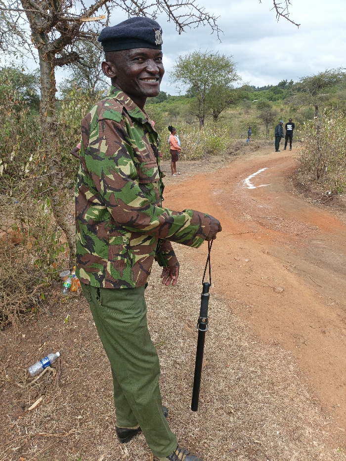 A smiling Kenyan soldier stands in a camo jacket, dark pants, and a black cap. He holds a black baton in his hand. A dirt road curves behind him with three people in the distance. A young person in a pink top and brown shorts is on the left of the road. Scattered trees and bushes dot the landscape under a cloudy sky. Litter is visible on the ground next to the soldier.