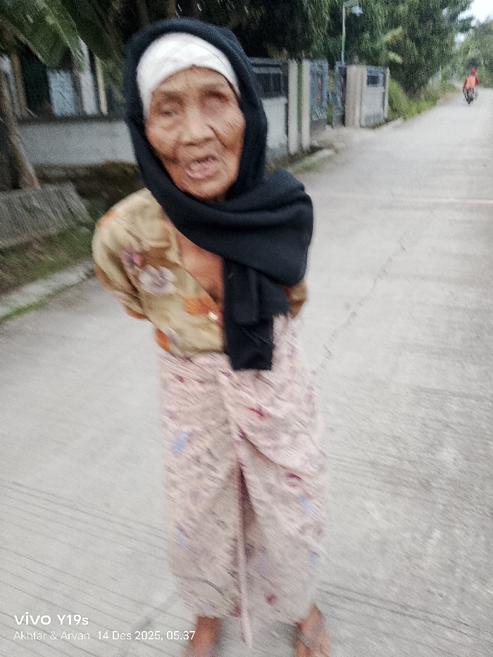 An elderly woman stands on a paved road. She wears a white head covering beneath a black headscarf, a patterned blouse, and a patterned sarong-style skirt. Her facial expression is serious. In the background, a road stretches away with houses on either side and a person on a motorbike in the distance. The picture's lower left corner shows phone information, including the phone model "VIVO Y19s" and a date "14 Des 2025, 05.37."