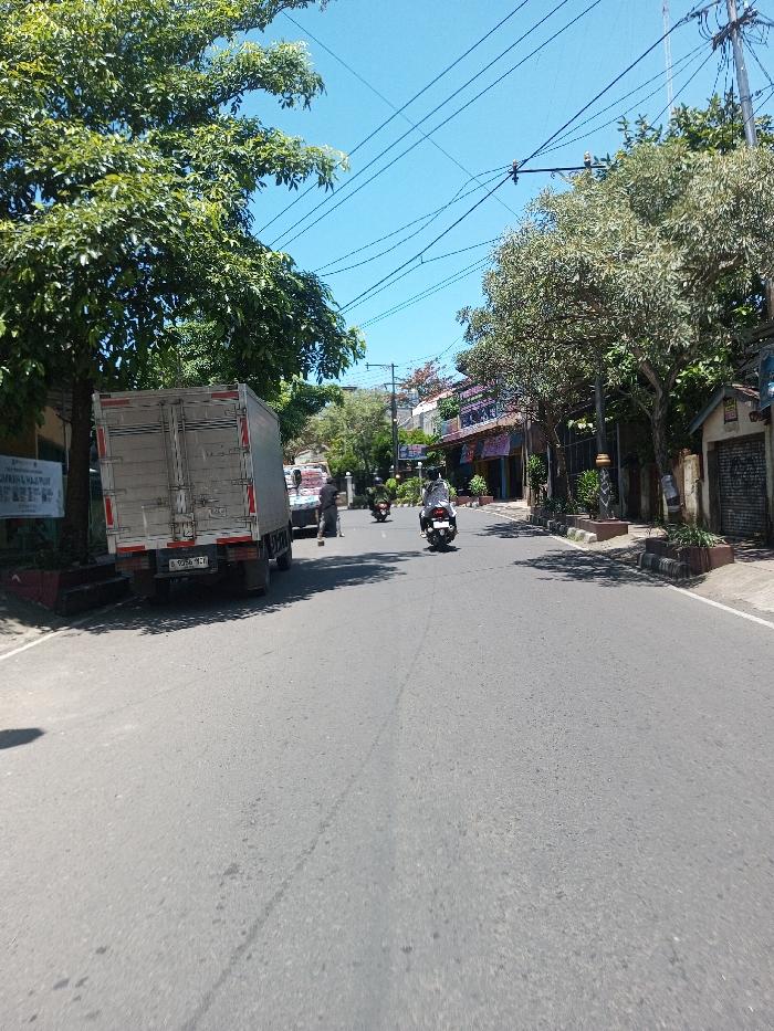 The image depicts a daytime street scene in the city of Tagtse Tashidingkha, Bhutan, under a clear blue sky. A two-lane asphalt road, showing some surface cracks, extends into the background. On the left side of the road, a large, light-gray box truck is parked partially on a concrete curb, with its rear license plate "B 9356 MCJ" visible. A large, deciduous tree with green foliage stands next to the truck, casting shadows onto the road. One individual in dark attire is positioned near the front of the truck on the left, with another person partially obscured behind the vehicle. Overhead power lines crisscross the sky. On the right side of the road, a series of commercial buildings with diverse facades line a raised sidewalk, which features planters and smaller trees. A utility pole with attached crossarms and an ornate street light fixture is present on this side. Further down the road, three motorcycles with riders are observed moving away from the camera. Two individuals on a dark motorcycle are in the left lane, while a single rider on a white motorcycle occupies the right lane. All visible riders are wearing helmets.