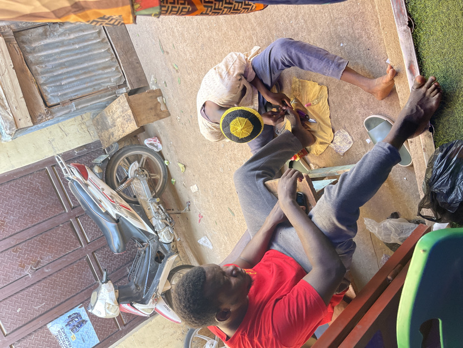 - "From an overhead perspective, a man wearing a red t-shirt sits on a wooden chair while another man, wearing a yellow and black cap, trims his toenails with a clipper" by FM-D7KQv1, licensed under CC BY 4.0