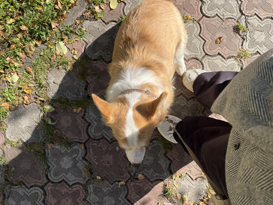 - "An outdoor scene in Krasnoyarsk, Russia, depicts a fawn and white Pembroke Welsh Corgi resting on patterned concrete pavers, adjacent to the lower body of a human subject" by FM-dkMlc2, licensed under CC BY 4.0