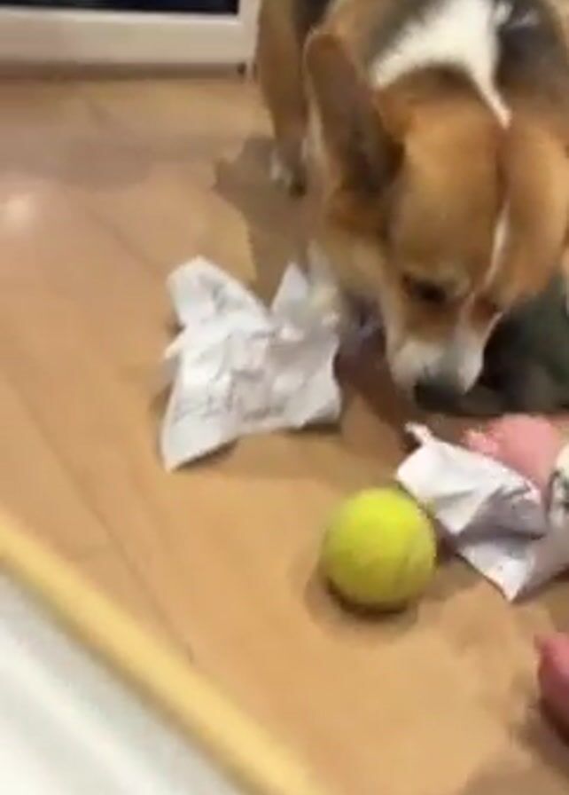 A short video shows a Pembroke Welsh Corgi dog on a wooden floor, surrounded by crumpled white paper, a green tennis ball, and a green plush toy