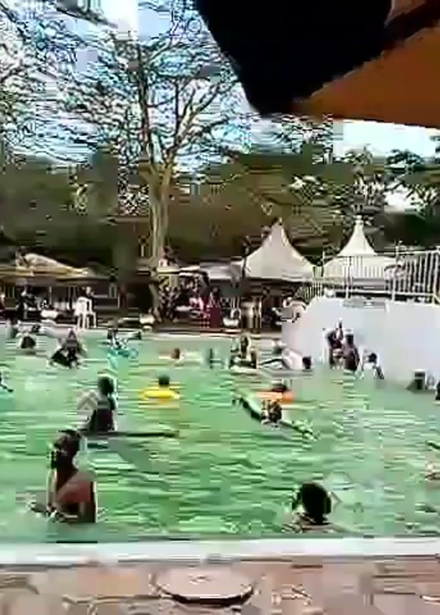 The video depicts a crowded outdoor swimming pool, with many people swimming, wading, and playing in the water