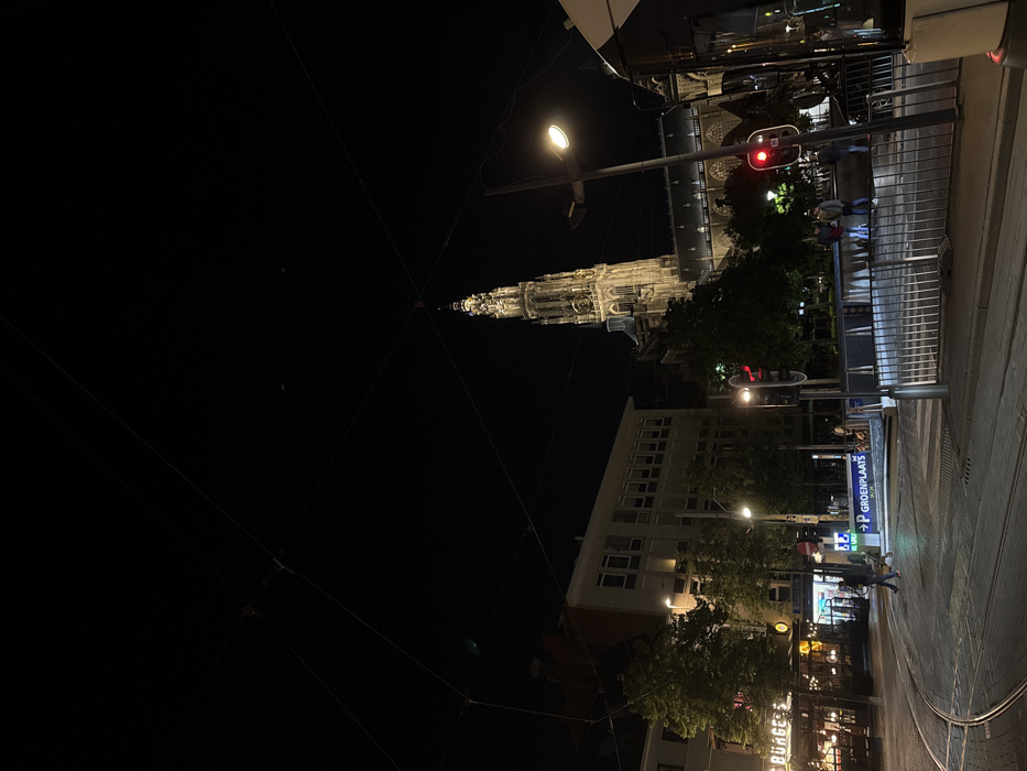 nighttime view of the Grote Markt in Antwerp, Belgium, a bustling public square in the heart of the city. The iconic Grote Markt (51.219, 4.401) is a historical landmark, with its grand architecture illuminated by streetlights. The scene is quiet, showcasing a handful of people walking on the pavement. The background features a towering church building with a pointed spire, while the street in the foreground is empty, except for a few cars. The street lights cast a warm glow on the street, which is lined with buildings on both sides. The tram tracks are visible in the foreground, with the tram stopped off-screen. The image provides a glimpse of the serene nightlife atmosphere in the city.