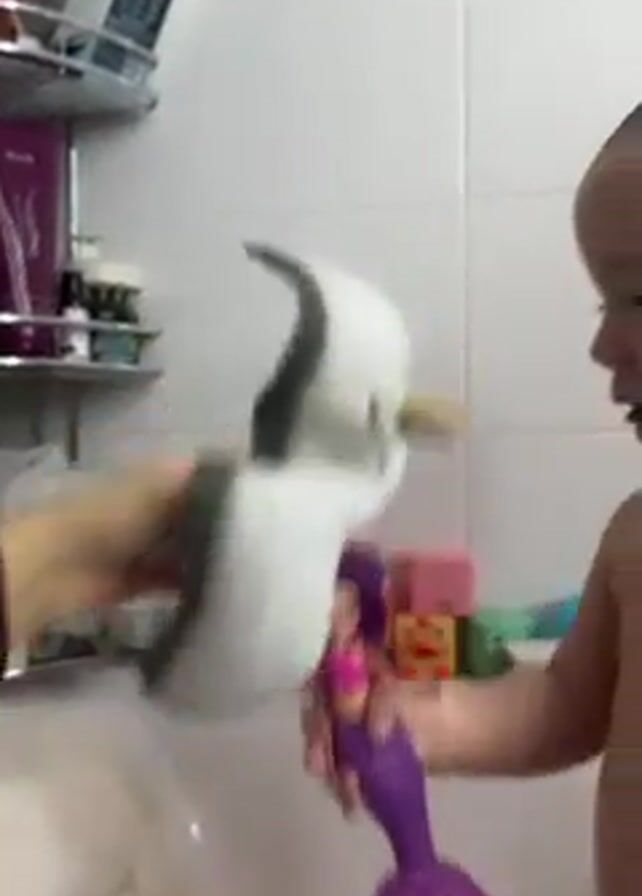 A small child stands in a bathroom with a mermaid doll while another person off-camera holds a toy seagull. The seagull is white and grey, and appears to be operated like a puppet. The seagull makes squawking sounds, and the doll is held up to the seagull’s beak. The bathroom is brightly lit with white tile walls. Various objects are on a shelf on the wall, including bottles, containers, soap, and a brush. The child appears to be looking at the doll.