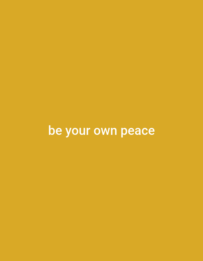 The image displays a solid, uniform mustard yellow background. Centered on this background is the phrase "be your own peace," rendered in white, sans-serif text. No individuals, specific objects beyond the text, actions, or interactions are depicted. The environment is a singular color field. There is no visual information present in the image to indicate a location in Khiva, Uzbekistan, or any other specific geographical area.
